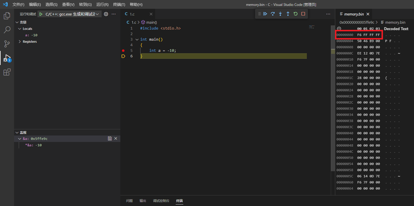 VS Code 调试取 &a 的地址后可以观察发现 16 进制的内存地址所存储的数据为 F6 FF FF FF,这恰好是 2 进制补码的 16 进制数,同时表明了整数在内存中存储的是补码。