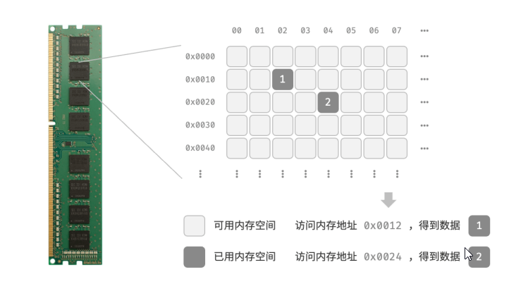 下图展示了一个计算机内存条,其中每个黑色方块都包含一块内存空间。我们可以将内存想象成一个巨大的 Excel 表格,其中每个单元格都可以存储一定大小的数据。系统通过内存地址来访问目标位置的数据。计算机根据特定规则为表格中的每个单元格分配编号,确保每个内存空间都有唯一的内存地址。有了这些地址,程序便可以访问内存中的数据。