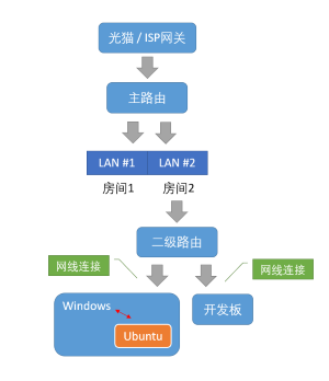 我住所大致的网络拓扑如图所示。(主路由的LAN口连接到二级路由器LAN口并开启中转桥接模式,充当交换机,二级路由在书桌旁边,这样也方便有线连接开发板。)